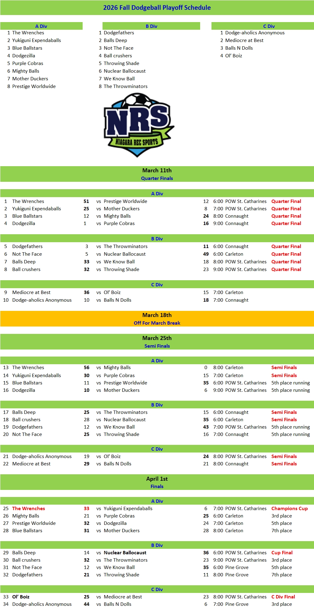 Dodgeball Playoff Schedule – Niagara Rec Sports