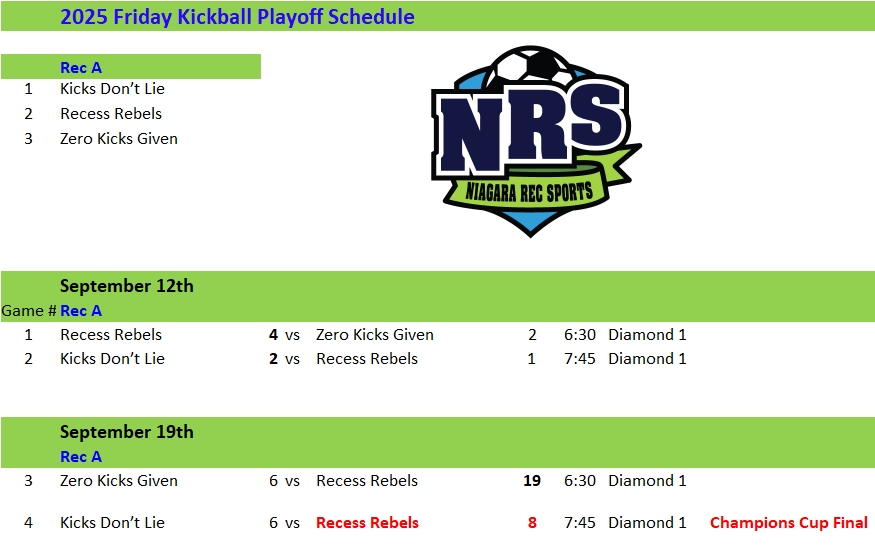 Friday Evening Soccer Baseball (Kickball) Playoff Schedule