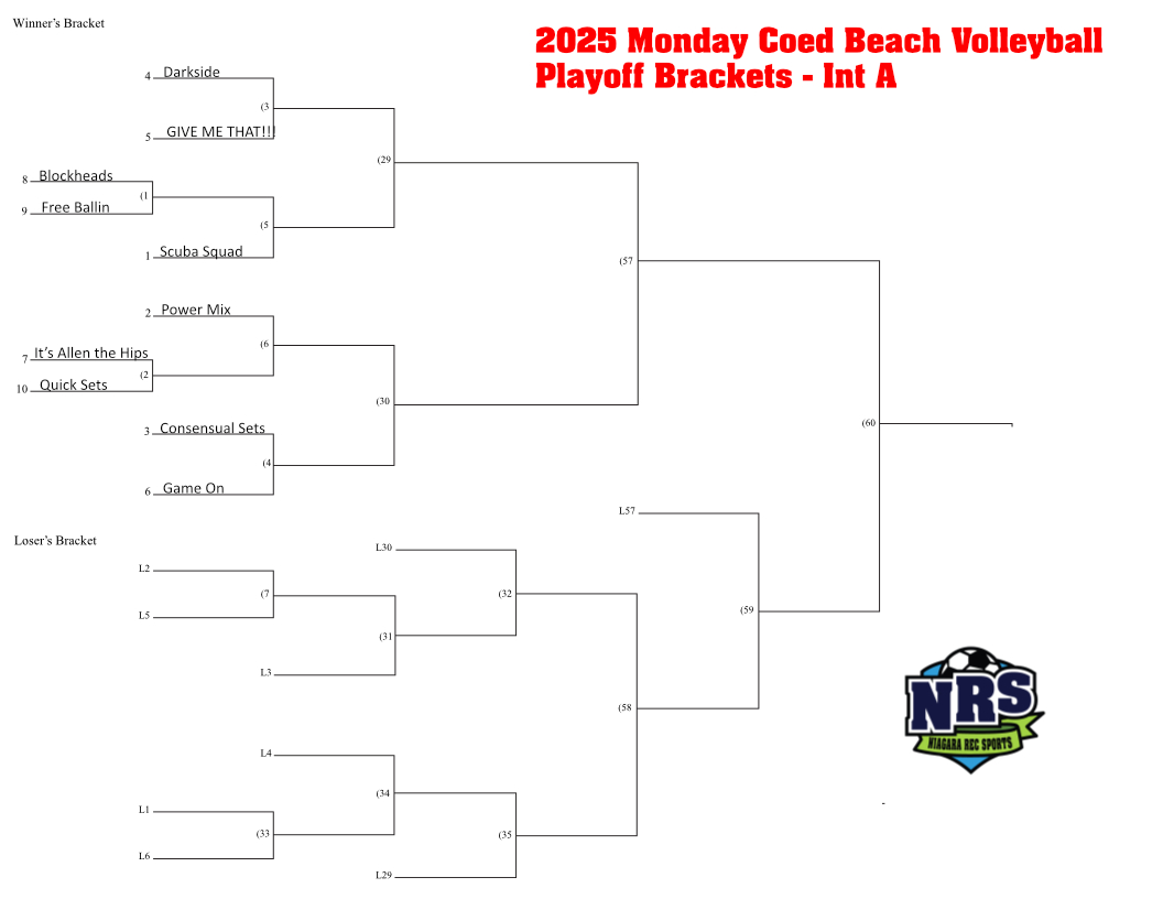 2025 Monday VB Playoff Bracket Int A – 10 teams – wk 1 Published August 20, 2025 at 1056 × 816 in Monday Evening Beach Volleyball Playoff Schedule