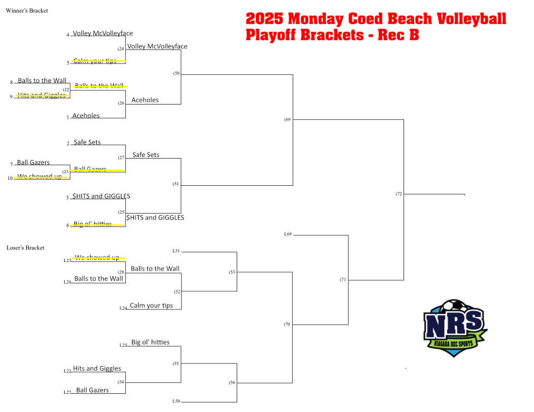 2025 Monday VB Playoff Bracket Rec B – 10 teams Published August 26, 2025 at 1056 × 816 in Monday Evening Beach Volleyball Playoff Schedule