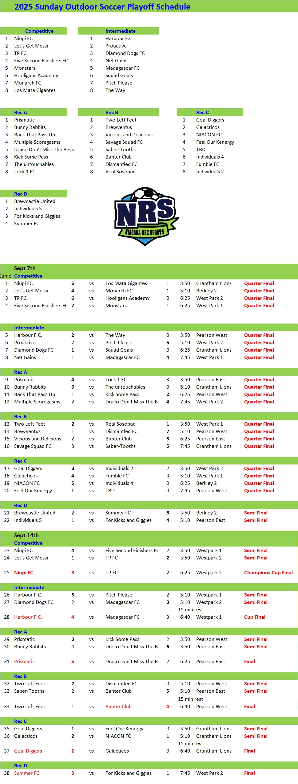 2025 Outdoor Sunday Soccer Playoff Schedule is Below