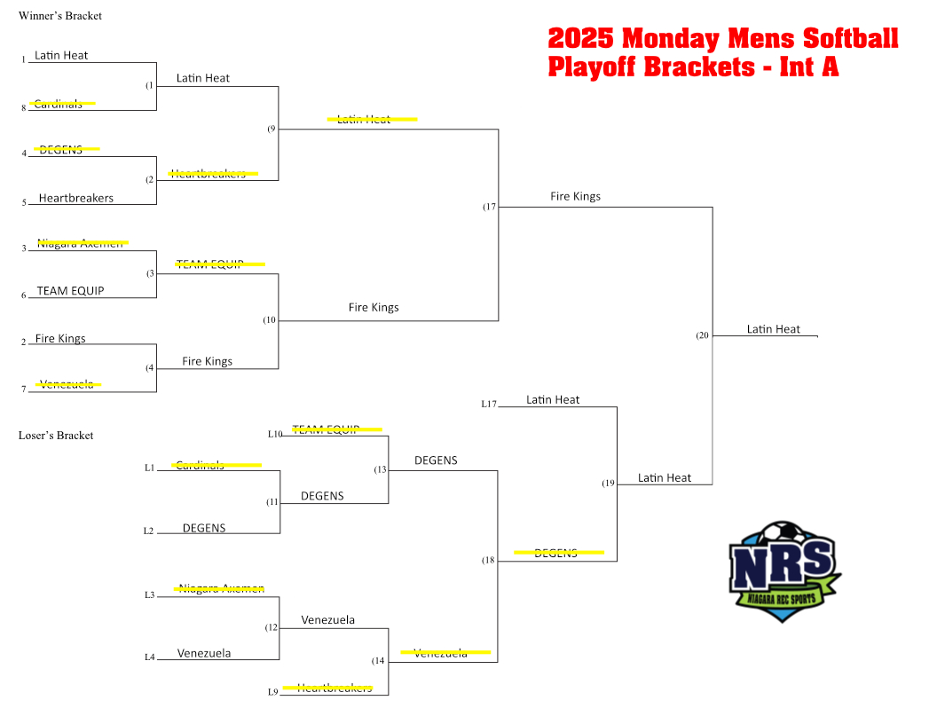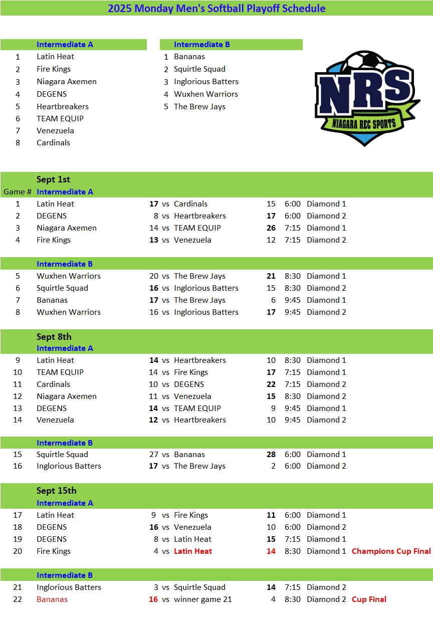 Playoff Schedule Monday Evening Men’s Softball Regency