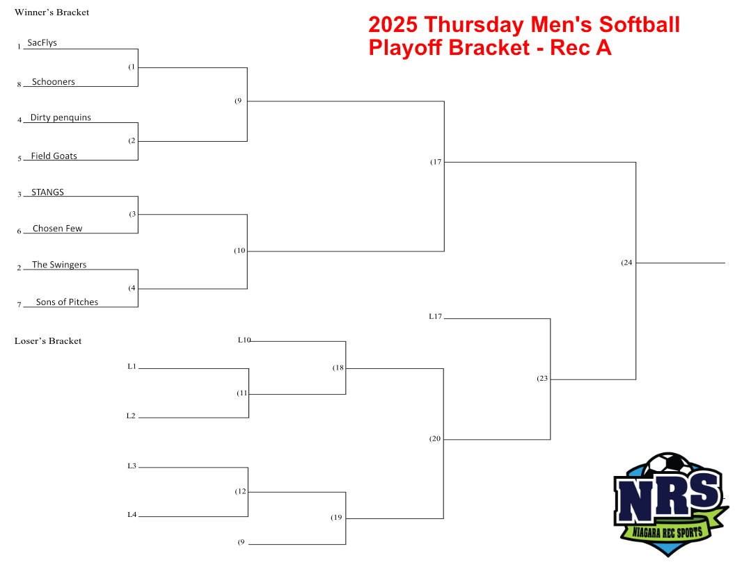 2024 thursday Mens 8 team Softball Playoff Bracket – Rec A Published September 16, 2025 at 1056 × 816 in Playoff Schedule Thursday Evening Men’s Softball Regency