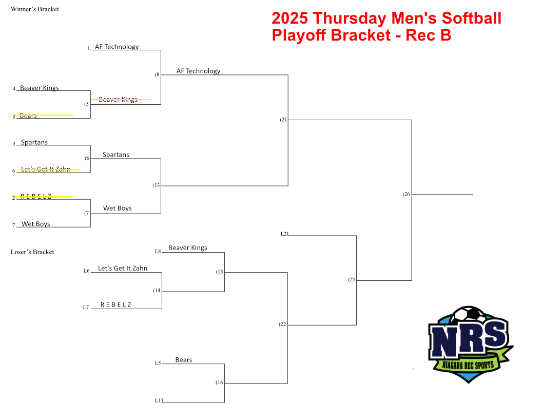 2025 thursday Mens 7 team Softball Playoff Bracket – Rec B Published September 20, 2025 at 1056 × 816 in Playoff Schedule Thursday Evening Men’s Softball Regency
