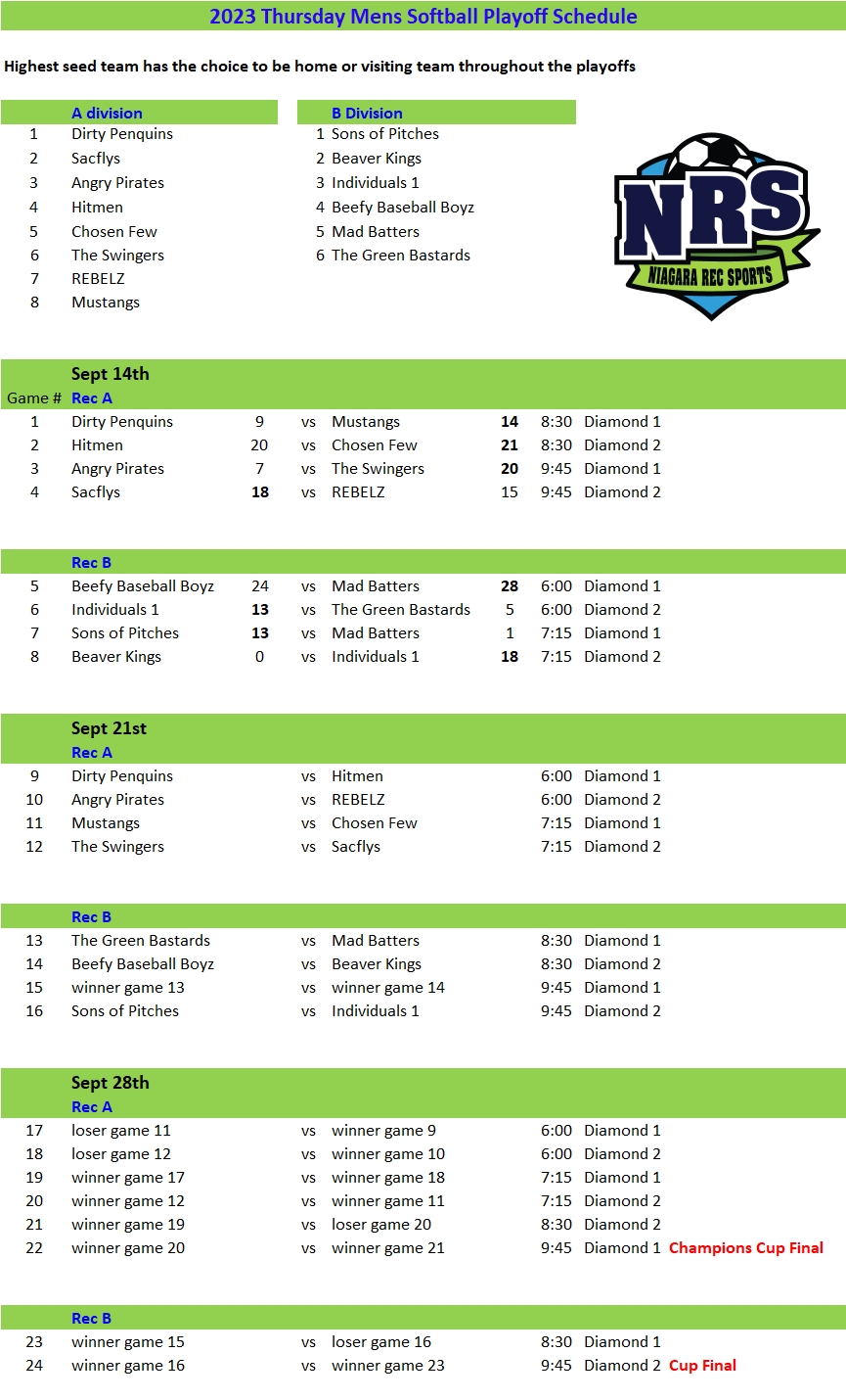 NRS 2023 Thursday Mens Softball Playoff Schedule-week 2