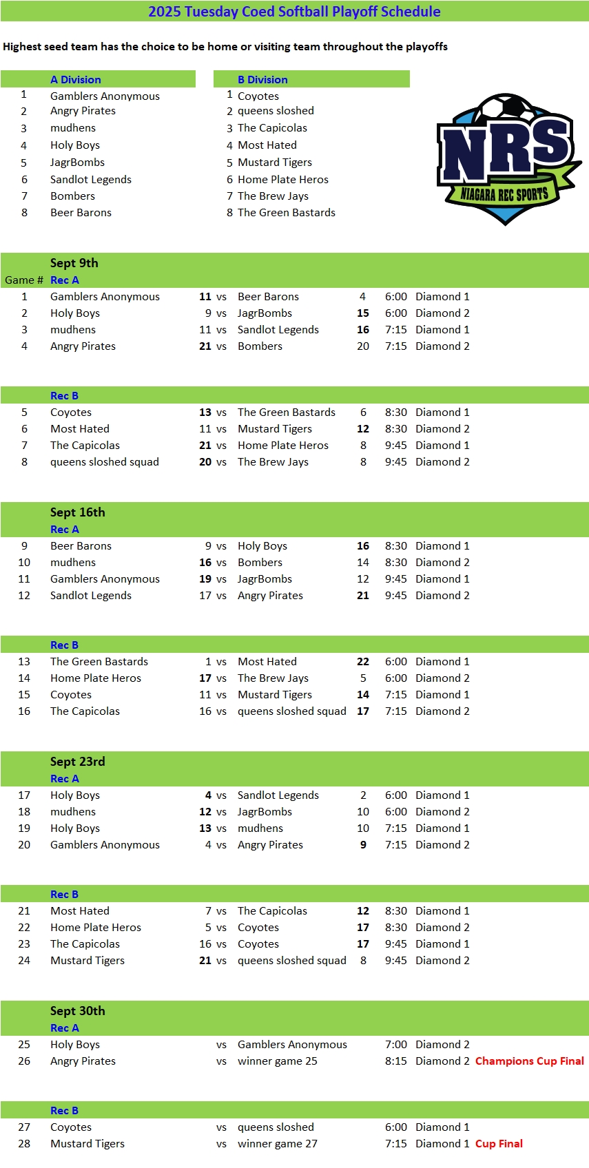 Playoff Schedule Tuesday Evening Men’s Softball Regency
