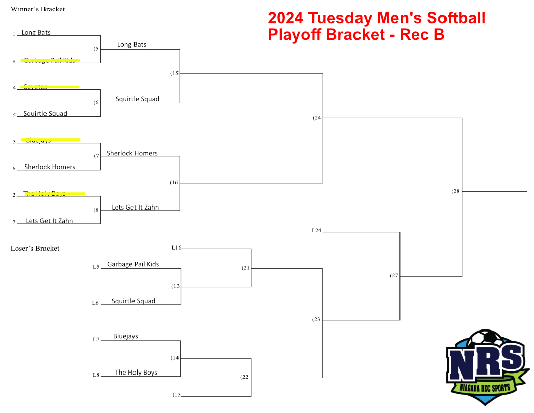 2024 thursday Mens 8 team Softball Playoff Bracket – Rec B Published September 14, 2024 at 1056 × 816 in Playoff Schedule Tuesday Evening Men’s Softball Regency