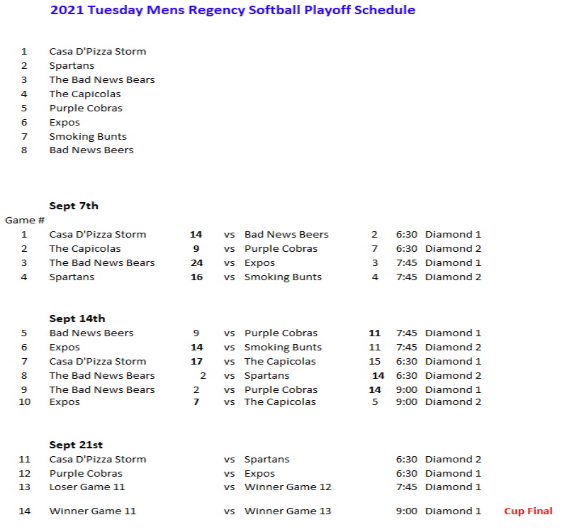 NRS 2021 Men’s Tuesday Evening Playoff Schedule Week 3 Published September 17, 2021 at 800 × 750 in Playoff Schedule Tuesday Evening Men’s Softball Regency