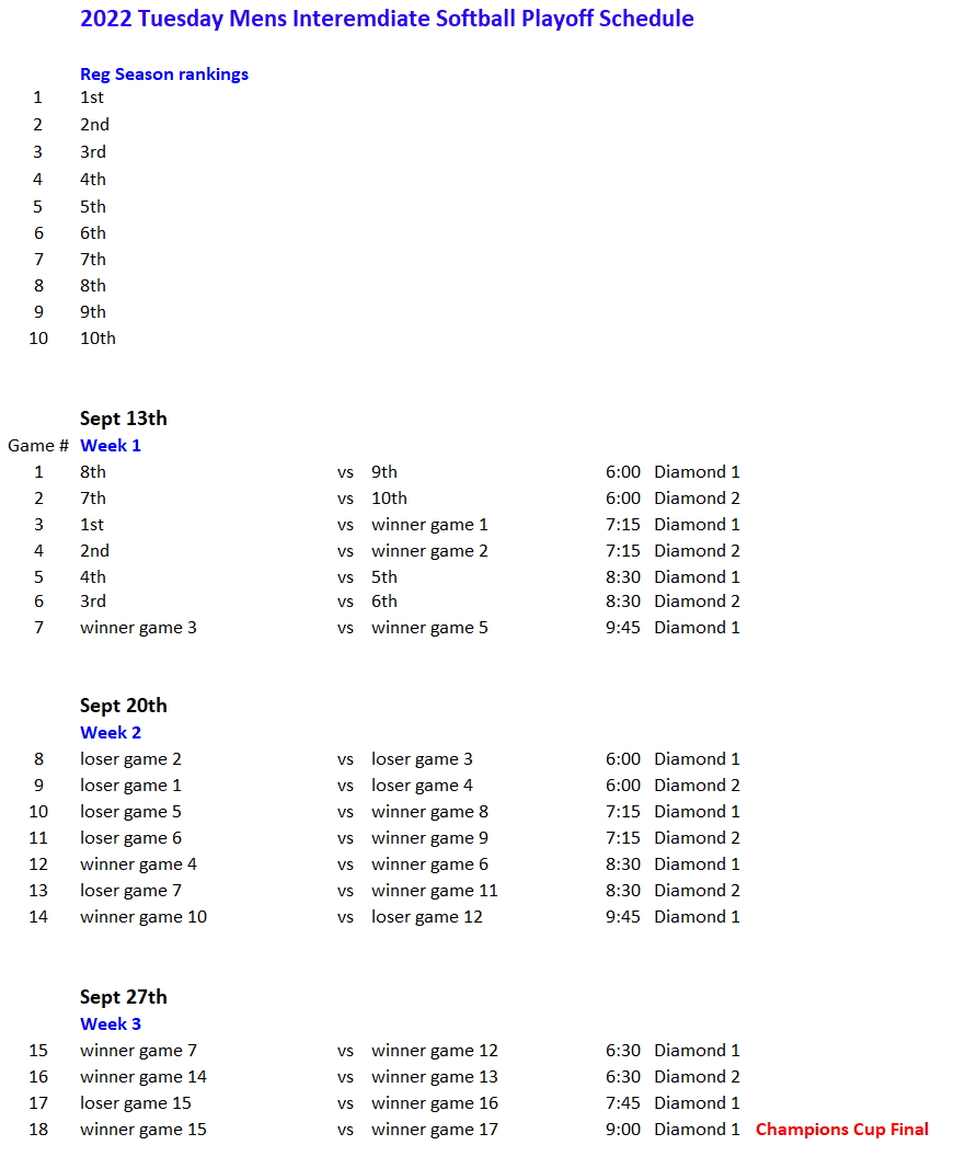 NRS 2022 Tuesday Mens Softball Playoff Schedule Published August 26, 2022 at 871 × 1066 in Playoff Schedule Tuesday Evening Men’s Softball Regency