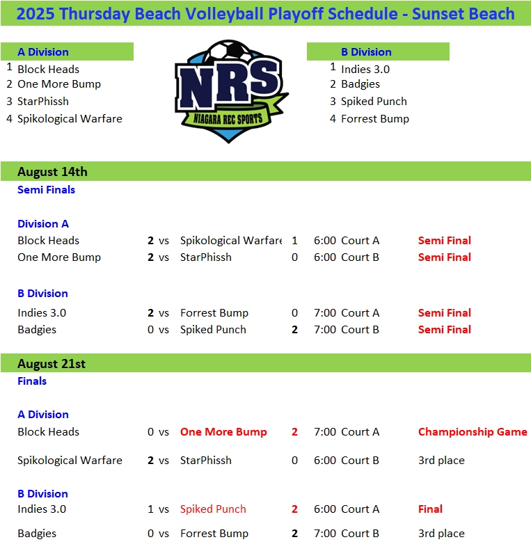 2025 Thursday Evening Beach Volleyball Playoff Schedule – Sunset Beach St. Catharines