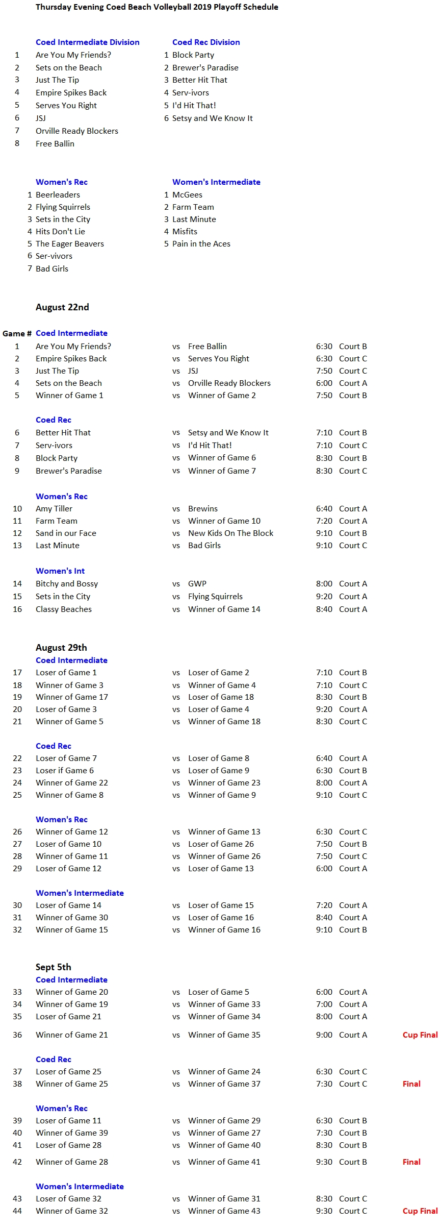 NRS 2019 Thurs Beach V ball Playoff week 1 Published August 17, 2019 at 865 × 2408 in Thursday Evening Beach Volleyball Playoff Schedule