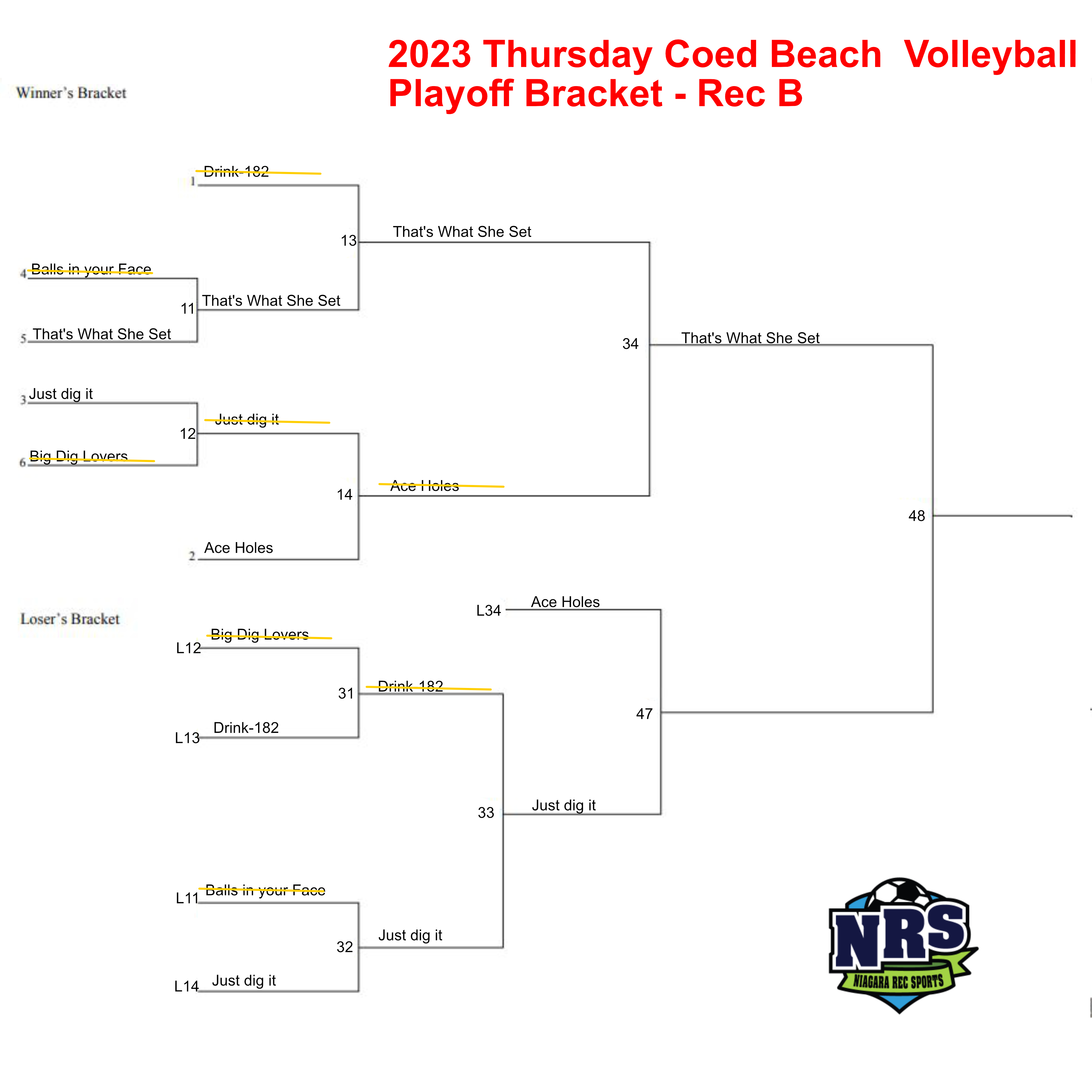 NRS 2023 Thursday 6 team Coed Beach Volleyball Playoff Bracket – Published September 11, 2023 at 3600 × 3600 in Thursday Evening Beach Volleyball Playoff Schedule