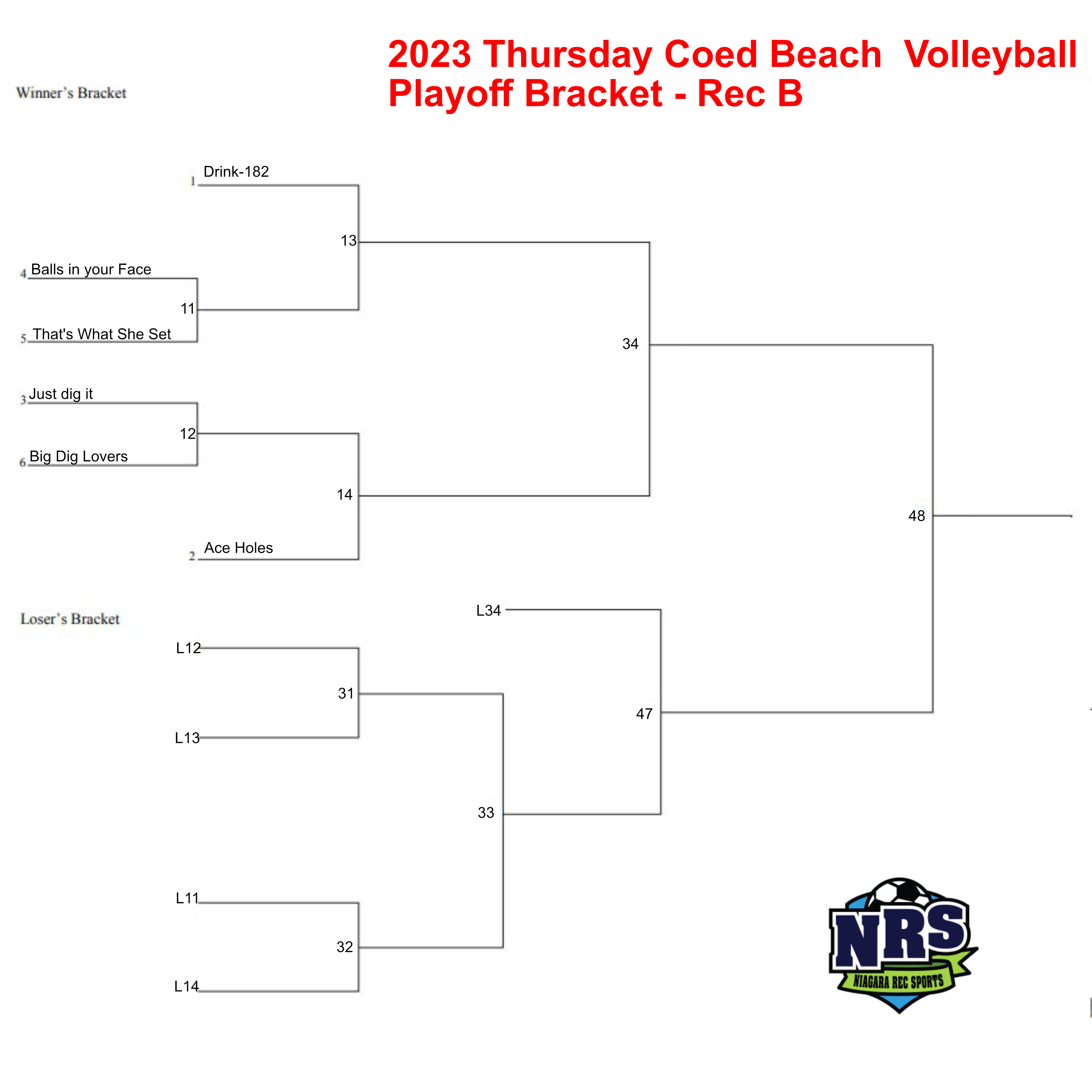NRS 2023 Thursday 6 team Coed Beach Volleyball Playoff Bracket – Published August 29, 2023 at 3600 × 3600 in Thursday Evening Beach Volleyball Playoff Schedule