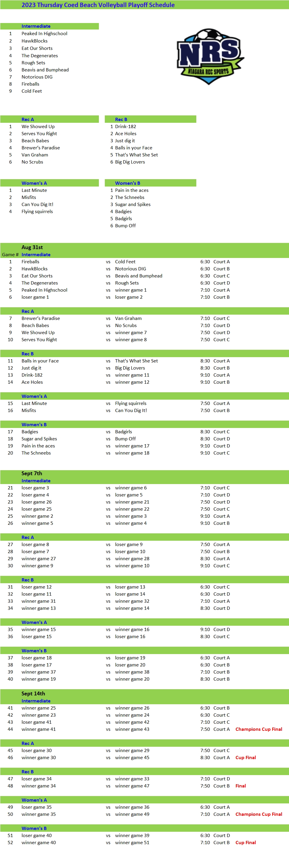 NRS 2023 Thursday Beach Volleyball Playoff Schedule Week 1 Published August 29, 2023 at 979 × 2890 in Thursday Evening Beach Volleyball Playoff Schedule