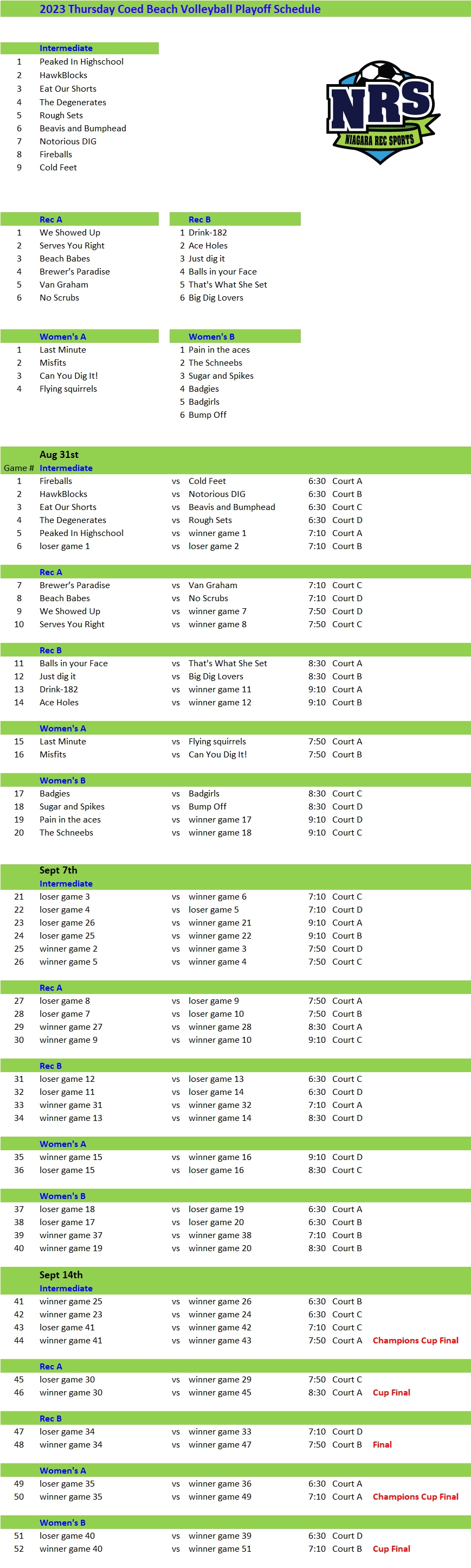 NRS 2023 Thursday Beach Volleyball Playoff Schedule Week 1a Published August 31, 2023 at 869 × 2890 in Thursday Evening Beach Volleyball Playoff Schedule