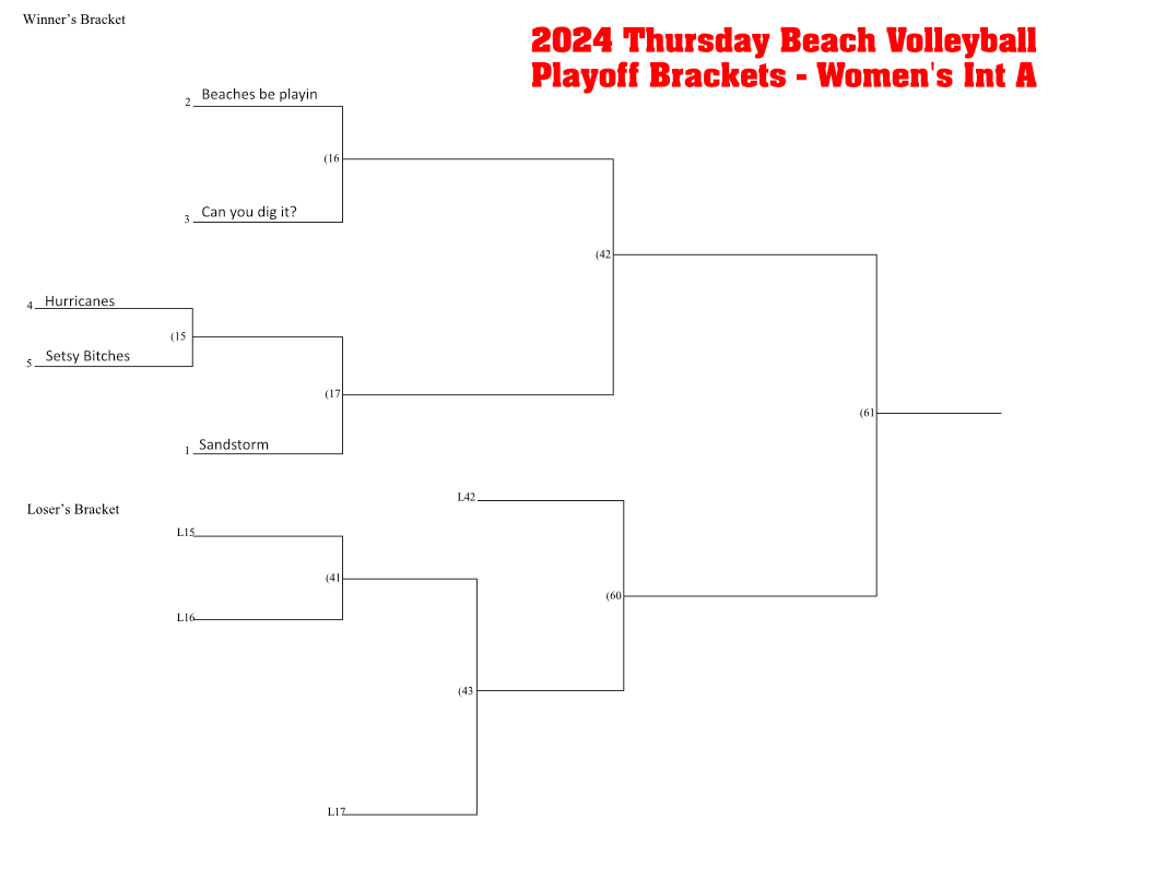 NRS 2024 Thursday Womens Playoff Bracket – Int A Published August 18, 2024 at 1056 × 816 in Thursday Evening Beach Volleyball Playoff Schedule