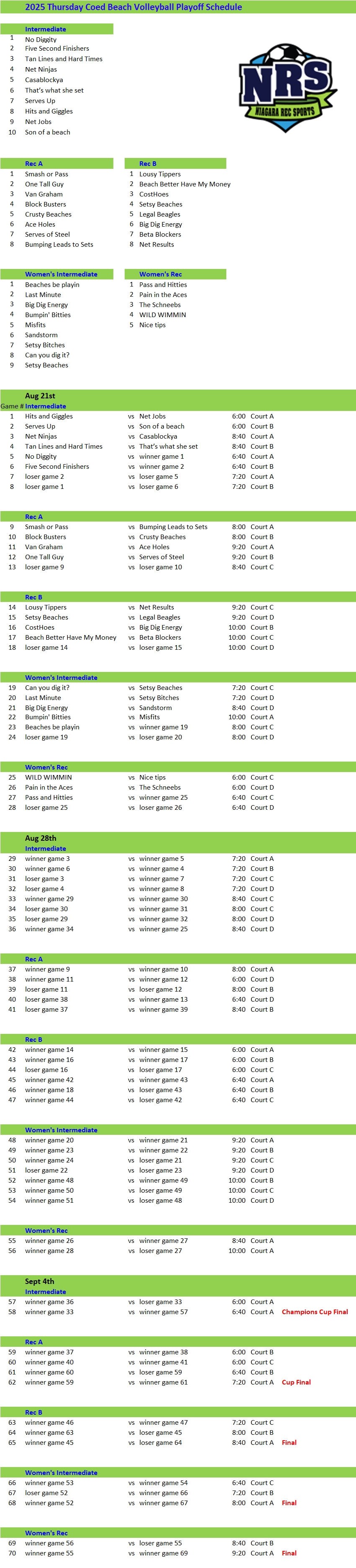 NRS 2025 Thursday Coed Voleyball Playoff Schedule week 1