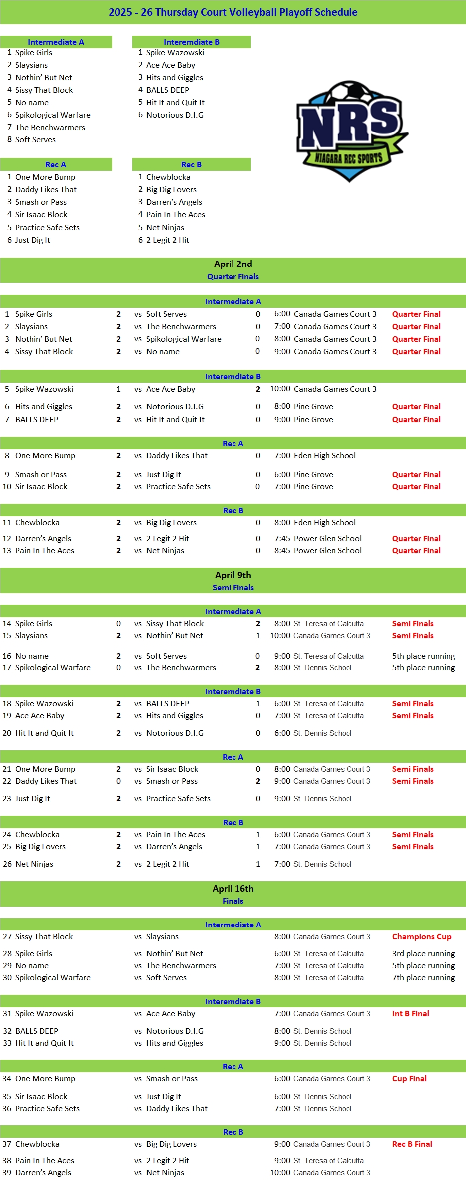 Thursday Evening Court Volleyball Playoff Schedule