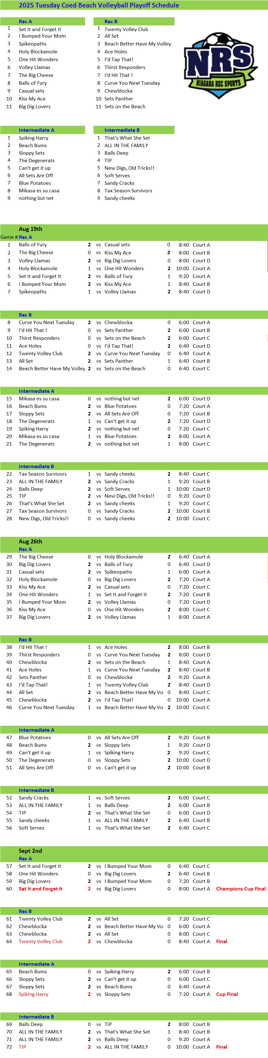 Tuesday Evening Beach Volleyball Playoff Schedule