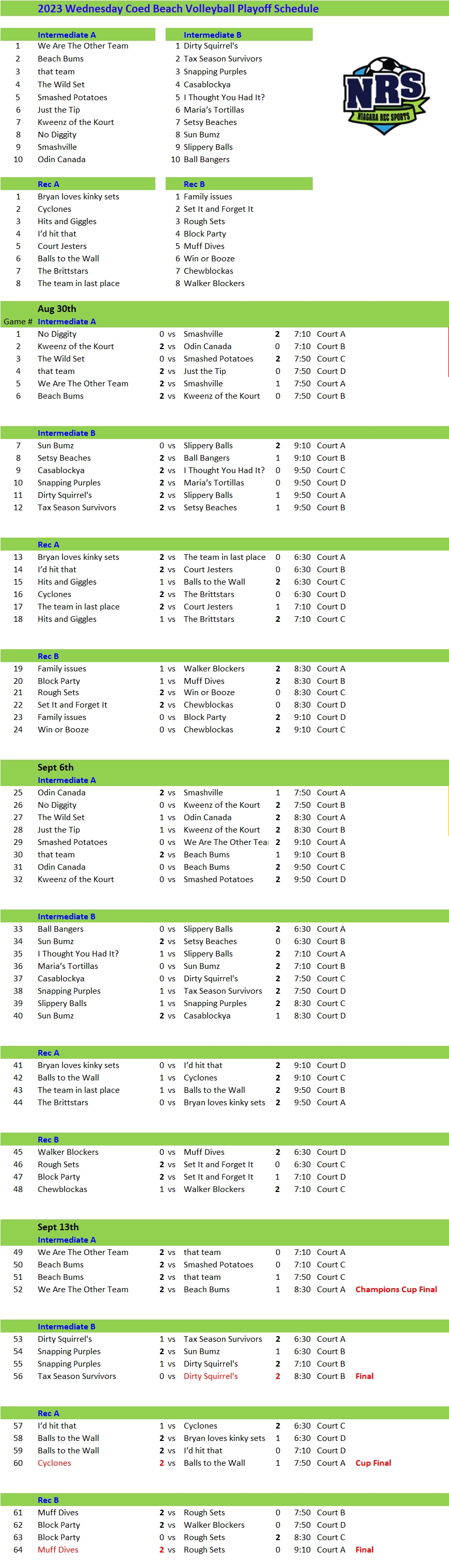 NRS 2023 Wednesday Coed Voleyball Playoff Schedule Final Published September 29, 2023 at 870 × 3036 in Wednesday Evening Beach Volleyball Playoff Schedule