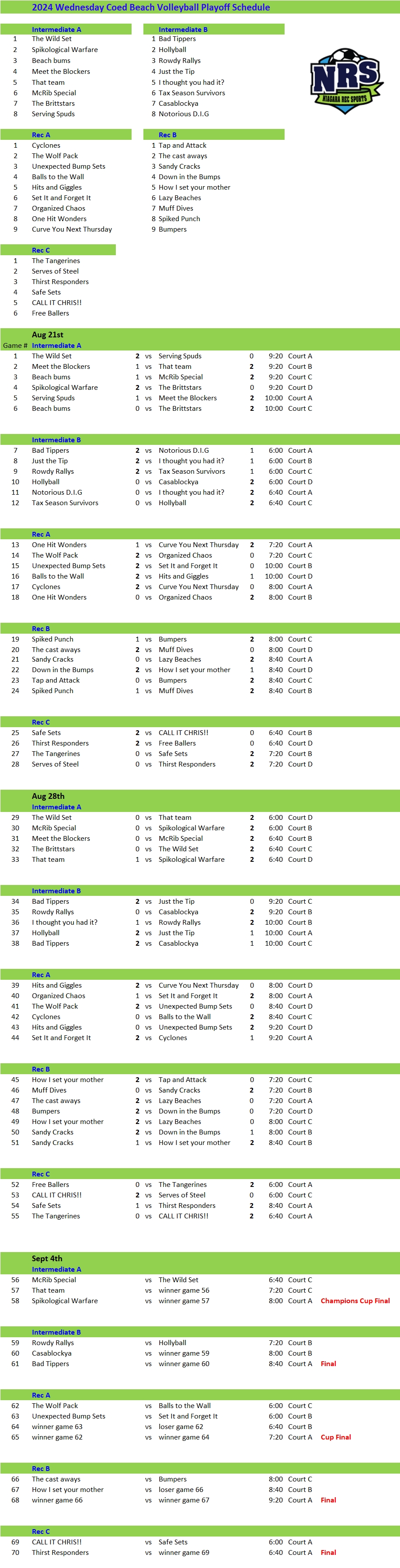 NRS 2024 Wednesday Coed Voleyball Playoff Full Schedule week 3