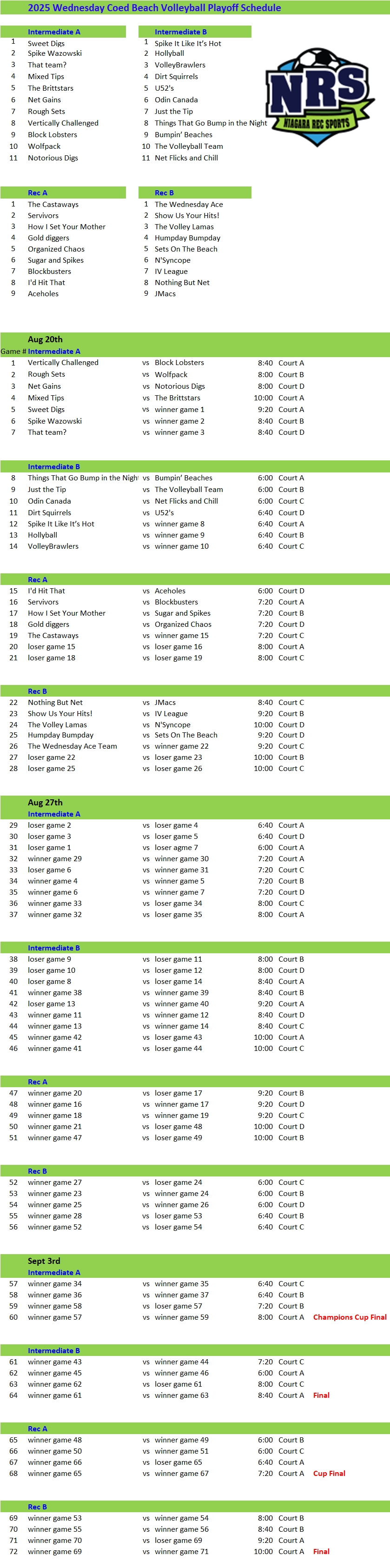 NRS 2025 Wednesday Coed Voleyball Playoff Schedule week 1 Published August 17, 2025 at 839 × 3372 in Wednesday Evening Beach Volleyball Playoff Schedule
